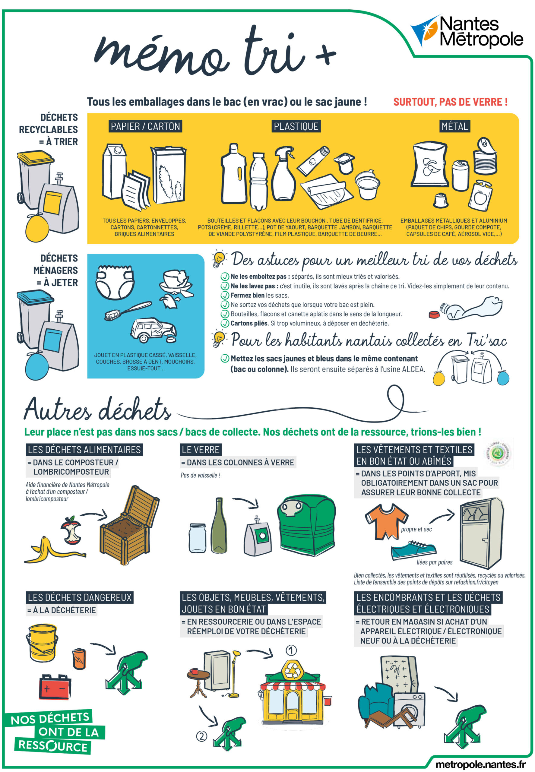- Bac jaune : les déchets recyclables, pour le tri sélectif (carton, récipients secs, bouteille, plastique, pots de yaourts…), il n’y a pas besoin de sacs, car les déchets triés se jettent directement dans le conteneur.